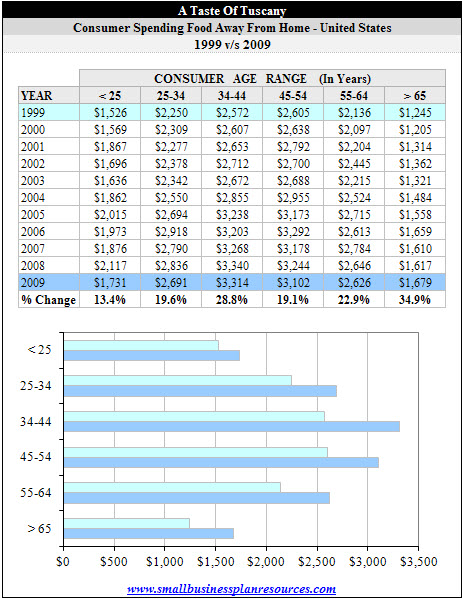 In this section of the business plan we analyze consumer spending on Food away from home for the entire country to get a sense of the larger trends in place for the industry in terms of consumer spending habits. There is no point trying to get into an industry where the macro economic spending trends are not working. That is not to say that if consumers are not spending as much as they used on food away from home, that one should not think about opening a restaurant like A Taste of Tuscany; what we need however is a realistic understanding of what the larger trends are so that we can adapt our business accordingly.