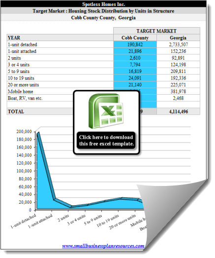 The calculations for this template are all done by us. All you have to do is to get the data and input in as indicated in the template. Our formulas will do the rest - its that easy! The chart that denotes the housing stock distribution for Cobb County, Georgia or your target market, will automatically update and all you have to do is to go to the output area, copy and paste it into your word document that contains the business plan.